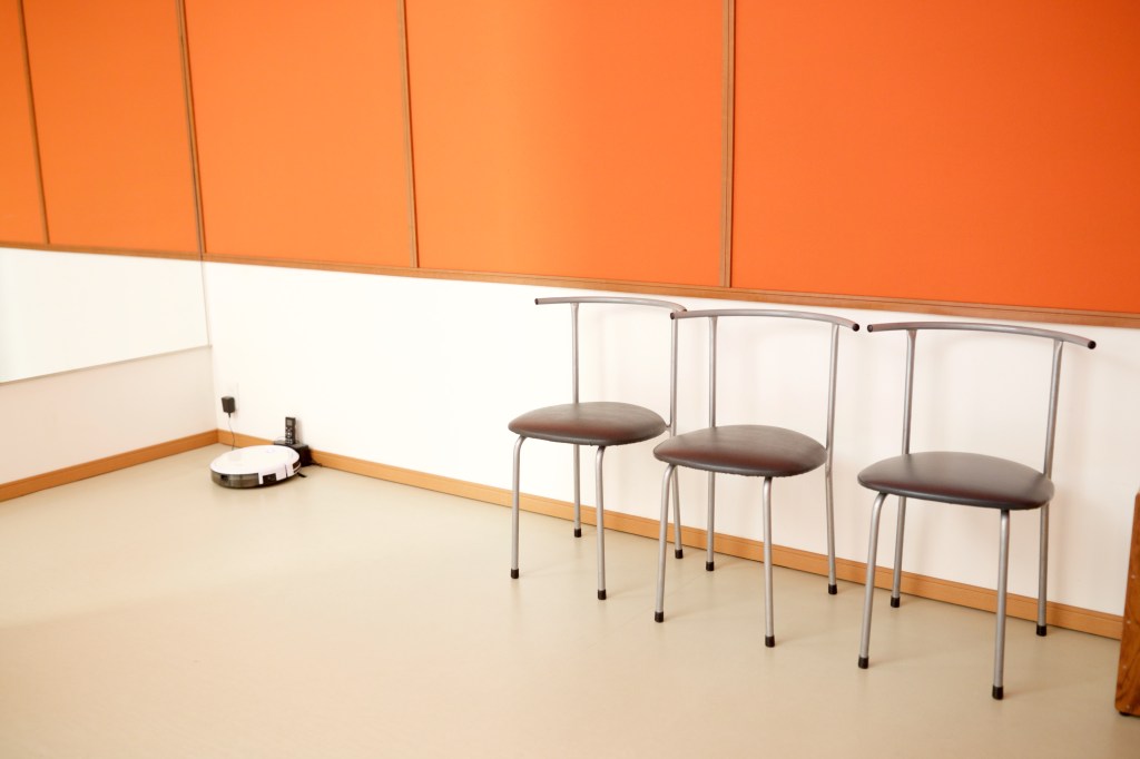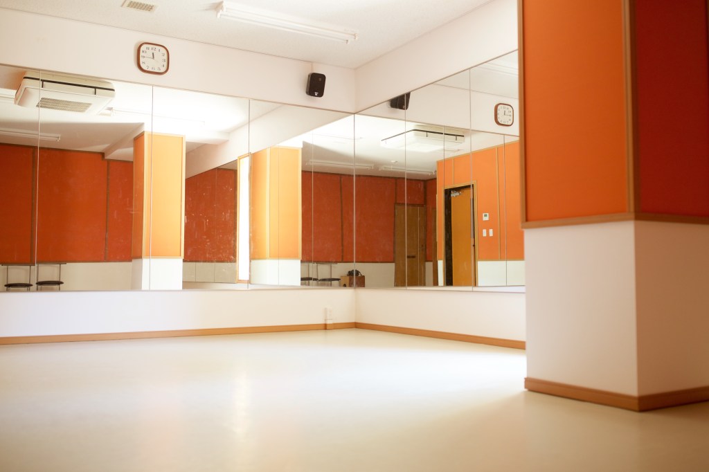 スタジオ内は二面が鏡ばりで、自分の動きを確認しながら練習ができます。オレンジ色の壁があたたかい小さなスタジオで、窓からはお庭が見えます。